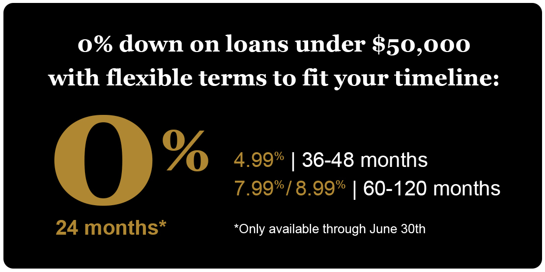 You’ll also benefit from 0% down on loans under $50,000, with pre-qualification that does not affect your credit score. And through June 30th, long-term financing (60 to 120 months) is reduced from 9.49% to just 7.99% for loans over $20,000 and 8.99% for loans under $20,000.