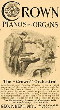 Due to the devastation of the Great Depression, the Crown brand name was produced up until the late 1940s. George P. Bent also produced the ‘Crown’ brand organs which were also sold and distributed by Sears Roebuck & Company on a limited basis at the turn-of-the-century. [1] The Geo. P. Bent Co. is now owned by the Adler Mfg. Co., of Louisville, Kentucky, which is now producing the "Crown" piano. [2]