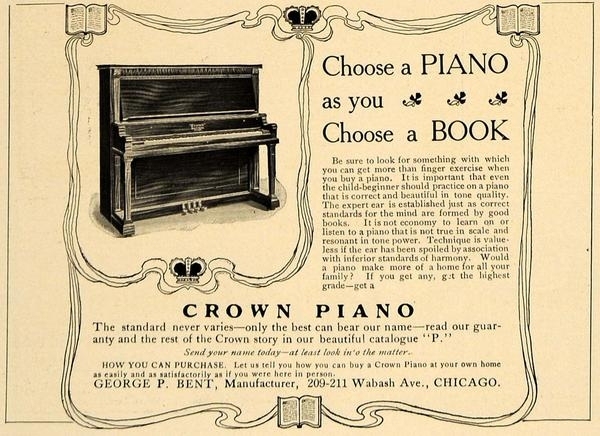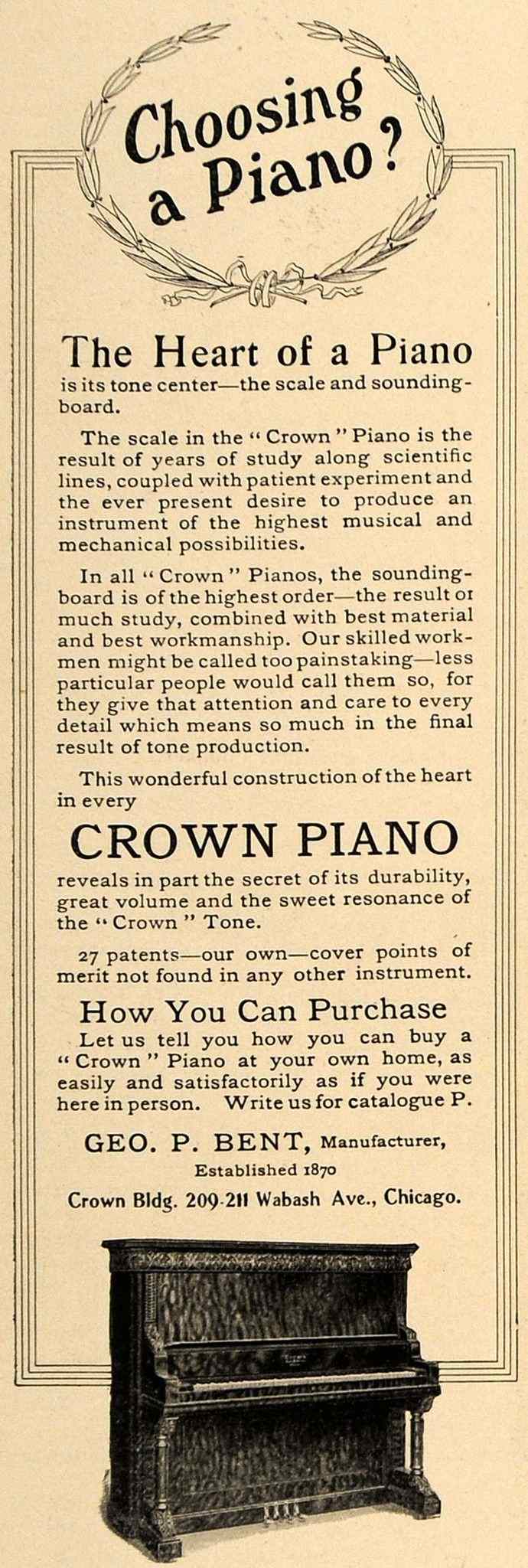 Established in 1870, the “Crown” piano was a lesser-known piano name and but built by the famous George P. Bent Piano Company. Despite its popularity as a particular piano brand by the company, the Crown piano was discontinued when the George P. Bent stopped building pianos in 1929. [1] [2]