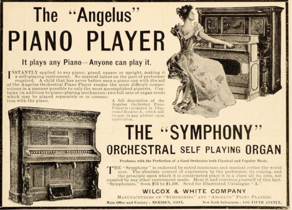 The Angelus was built by several manufacturing companies, starting with the Premier Grand Piano Corporation in the late 1800s until the Great Depression. Also made by Hallet and Davis, and later popularized by the Wilcox and White Company, the Angelus was a reproducing piano with a unique handmade player action that was easily applied to any piano [1]. Wilcox and White produced about 500 Angelus pianos a year out of their Meriden, Connecticut factory, which was situated across the street from their big competitor, the Aeolian Company[2, 3]. The use of the name Angelus was clever marketing, inspired by a French painting that had been in the American news for being bought at a high price in a Paris auction. The Angelus trademark first appeared on player pianos in 1897. [3]