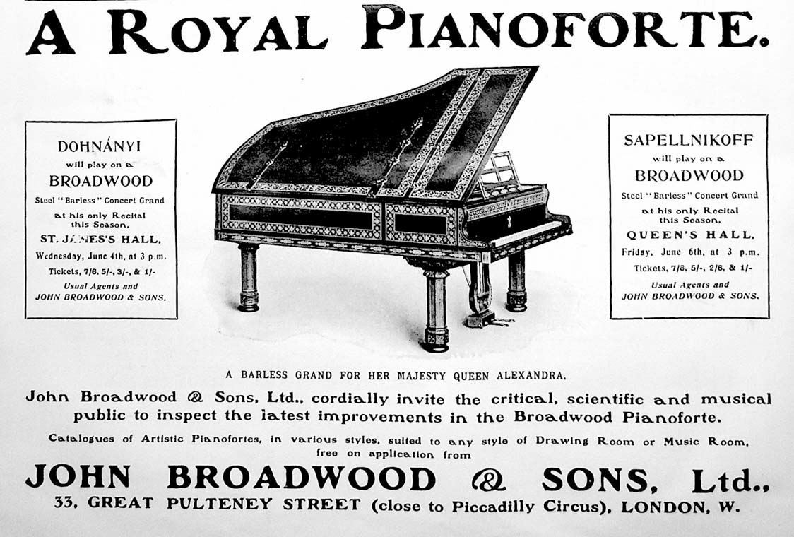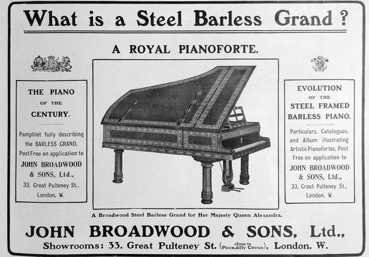 Broadwood makes squares, concert grands, bichorda, semi and SDR grands, cabinets, cottage uprights, cottage grands, boudoir grands, grands and uprights. They were pioneers in developing a steel and iron strain-resisting structure and a barless system that does not interfere with stringing [2].