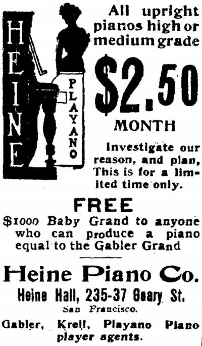 The Heine Piano Company was a West Coast piano manufacturer that was established in San Francisco in 1889. The Krell Piano Company actually produced Heine pianos for several years in addition to the company manufacturing its own instruments. The Heine Piano Company stopped manufacturing pianos in the early 1900’s. [1]