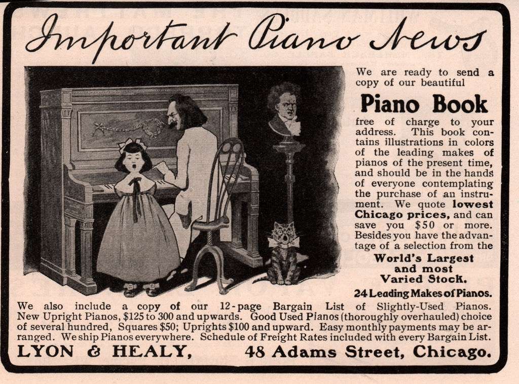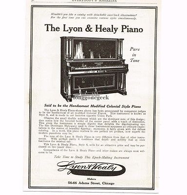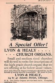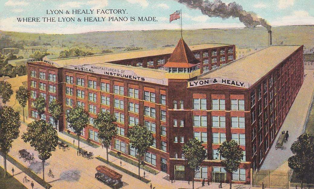 Lyon & Healy, established in 1864, originally made concert harps and was the leading manufacturer in the world. They also built pianos, player pianos, organs, and many other types of musical instruments for many years. As an early company, the Lyon Healy brand was known for selling a variety of musical products like sheet music, strings, piano parts and other items that positioned them as one of the earliest “music stores” in the country at the time. [1] By 1876 after a devastating factory fire, the company began producing pianos and organs to source their retail store. [1] [2]