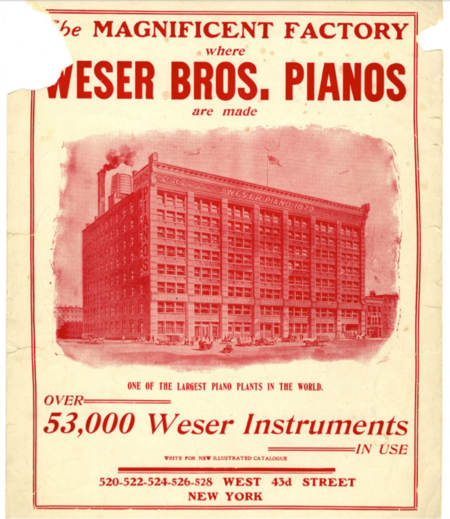 Weser produced grand, upright, and, perhaps most notably, player pianos. Many people recognize Weser pianos for their elaborate case designs and quality tone, as well as their distinctive Colonial and period models, among other defining characteristics.