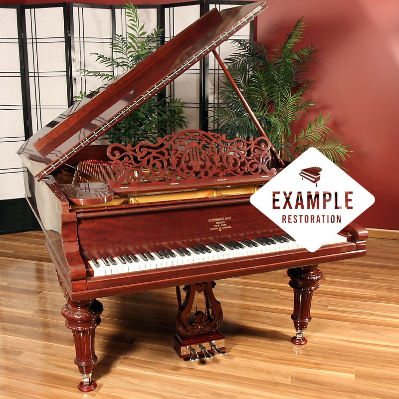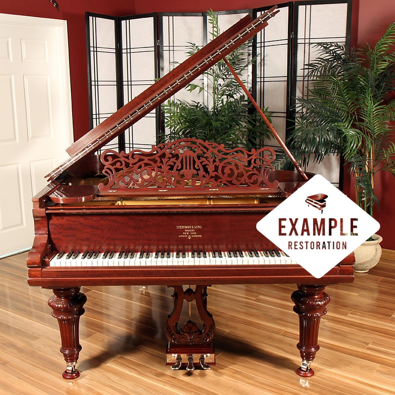 This Victorian-styled Model A in Africain Mahoghany has exquisite carvings, "Ice Cream Cone" legs and includes a matching bench. It will be fully restored and refinished in a classic wood tone stain or satin ebony. The example photos are of a similar Steinway A's that have already been restored, the last few photos are of the exact piano that will be restored to your preferences. See below for the full list of work our expert Craftsmen will complete before the piano is shipped.