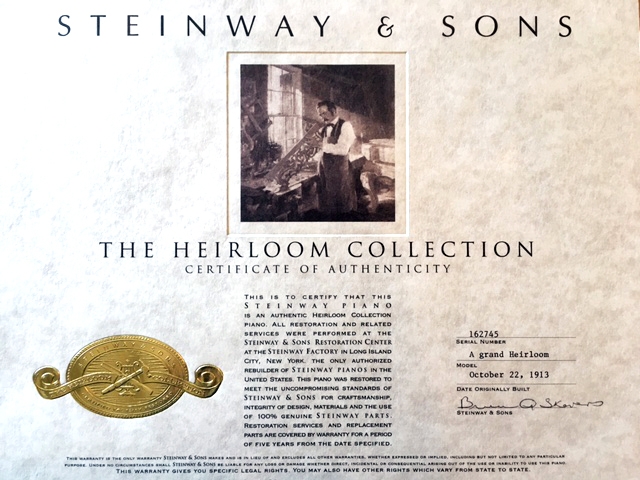 This 1913 Steinway Heirloom Model A was Steinway Factory restored with a new soundboard, a new action, and a satin ebony finish. Our team is committed to ensuring that the tone of this piano aligns with your personal preferences. The piano also includes a matching bench. View videos of this piano being played by a concert pianist here - Videos